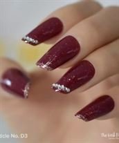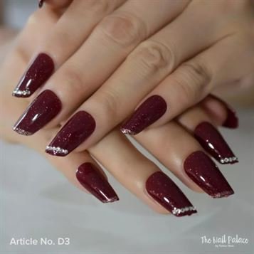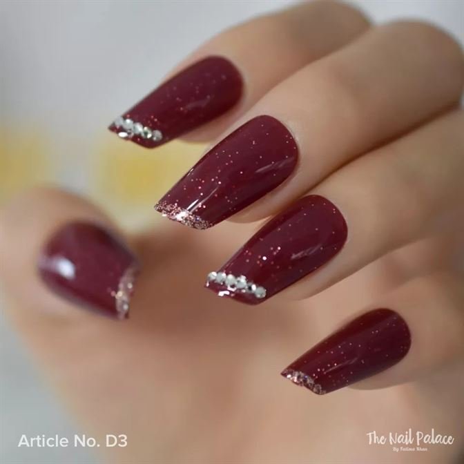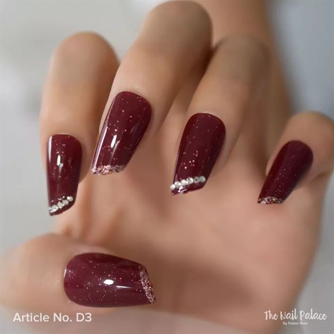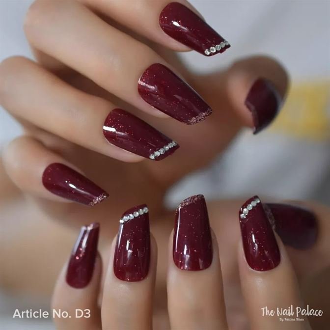 Dark Red Glossy Fake Nails Lipstick Shape Shimmer False Nail Tips Long Length With Rhinestone Press On Nails 22-24pcs (Glue Not Included)