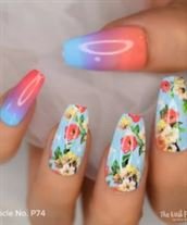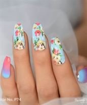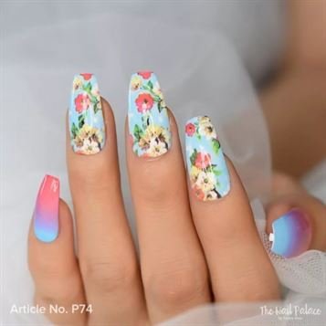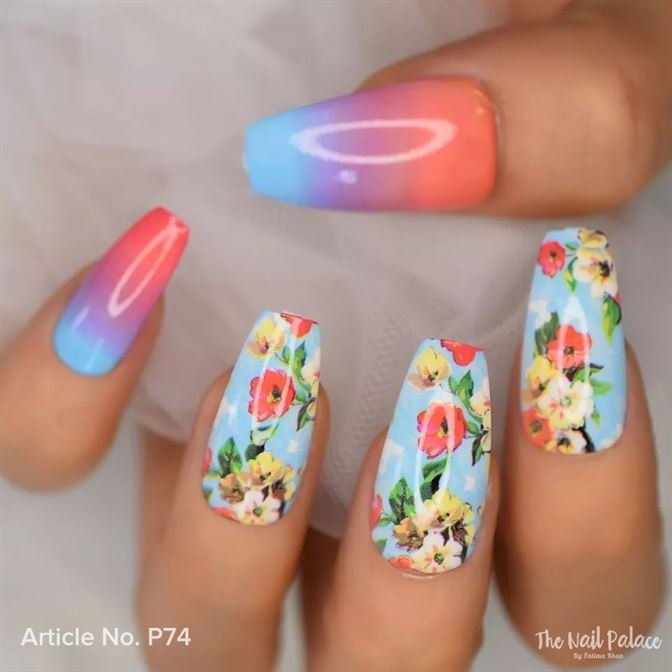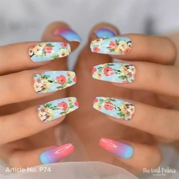 Designer Artificial False Nails Blossom Flowers Painting Coffin/Ballerina Long Press On Nail Tips Summer Fake Artificial Femmes Faux Ongles 22-24pcs (Glue Not Included)